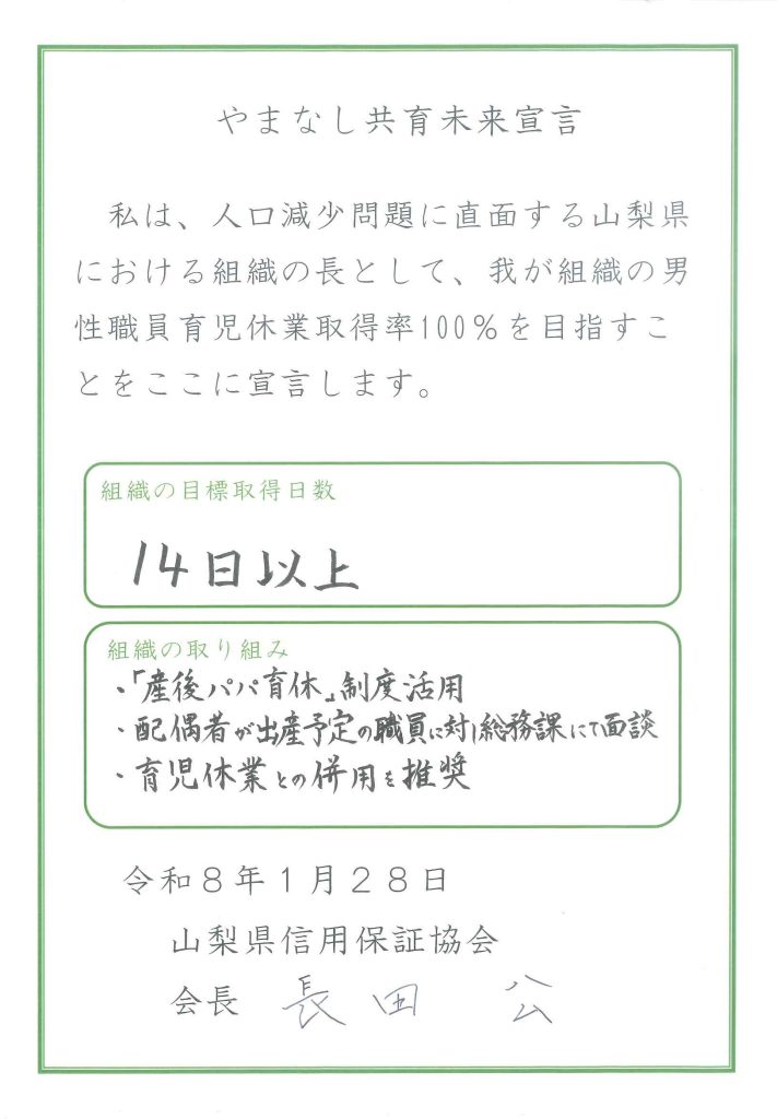 2026年2月4日 「やまなし共育未来宣言」に参加しました 当協会は山梨県が推進する「やまなし共育(ともいく)未来宣言」に参加しております。 「男性職員の14日以上の育児休業取得率100%」を目標に掲げ、職員の子育てを積極的に支援し、働きやすい職場環境づくりに取り組んでまいります。