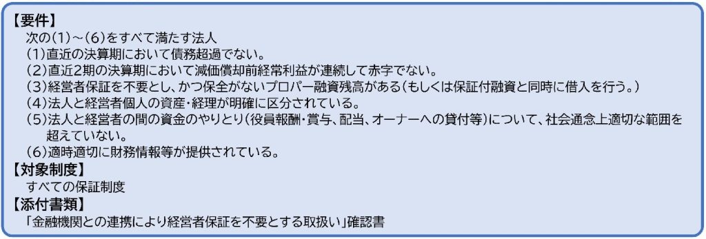 以下の取扱いのいずれかに該当する場合は、経営者保証を不要とする保証の取扱いができる可能性があります。